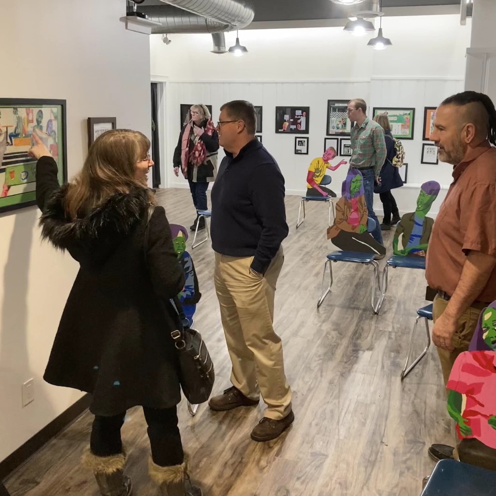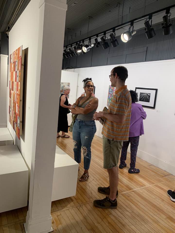 This is me speaking with. the juror at the Oak Park Art League.