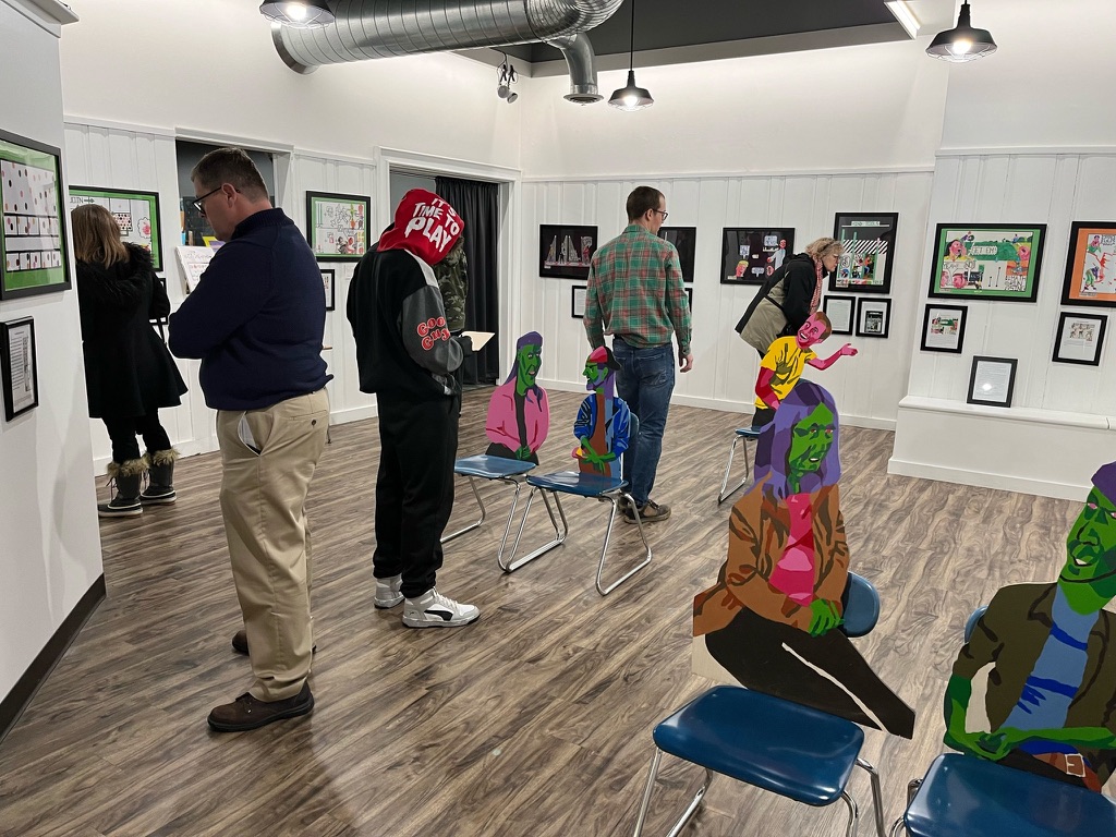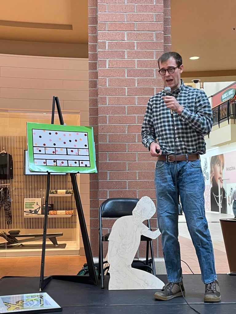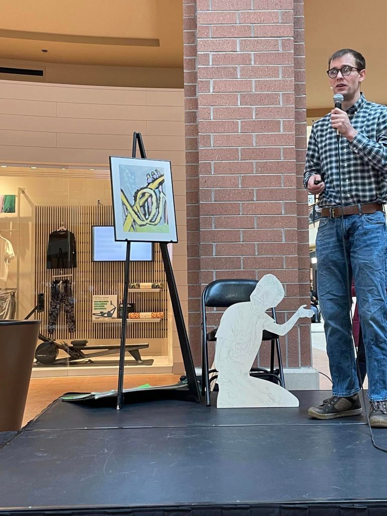 This is me giving an artist talk for Youth Art Month at Jorden Creek Mall in West Des Moines, Iowa in March 2023.
