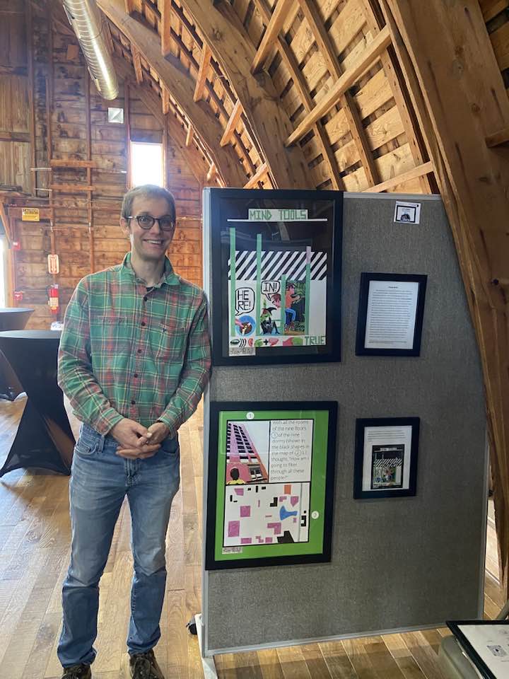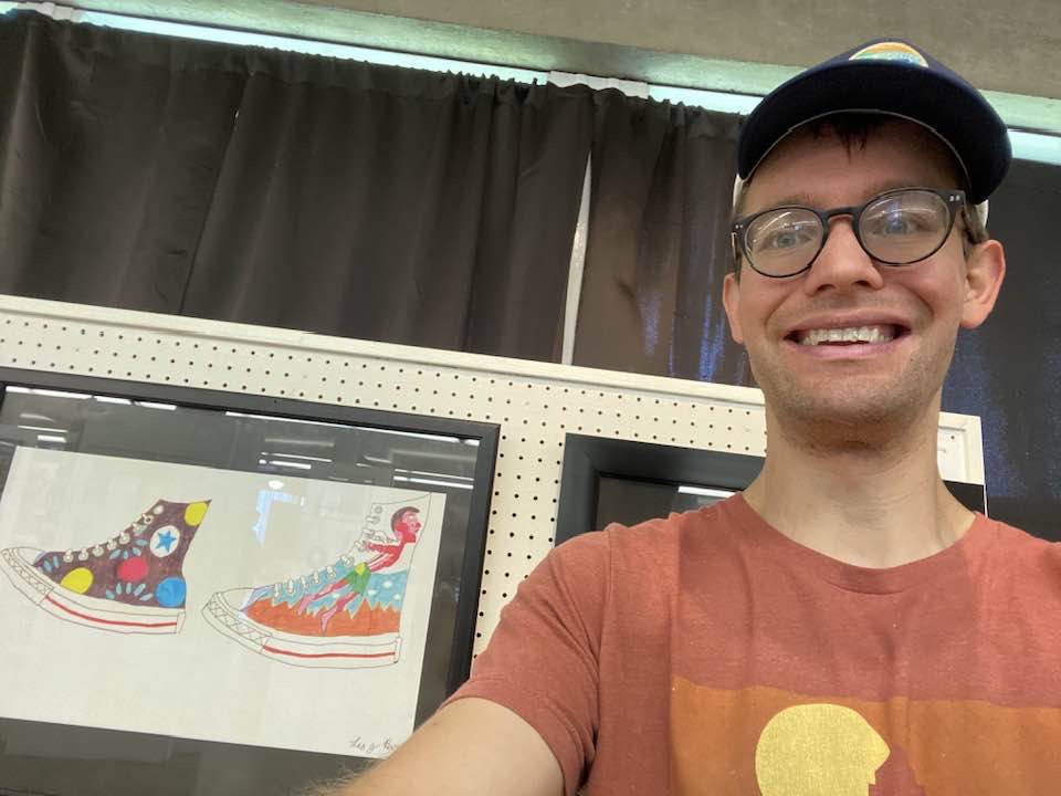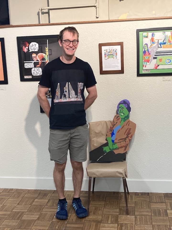 This is me with my drawings at the Art in the Barn through the Johnston Library in October 2023.
